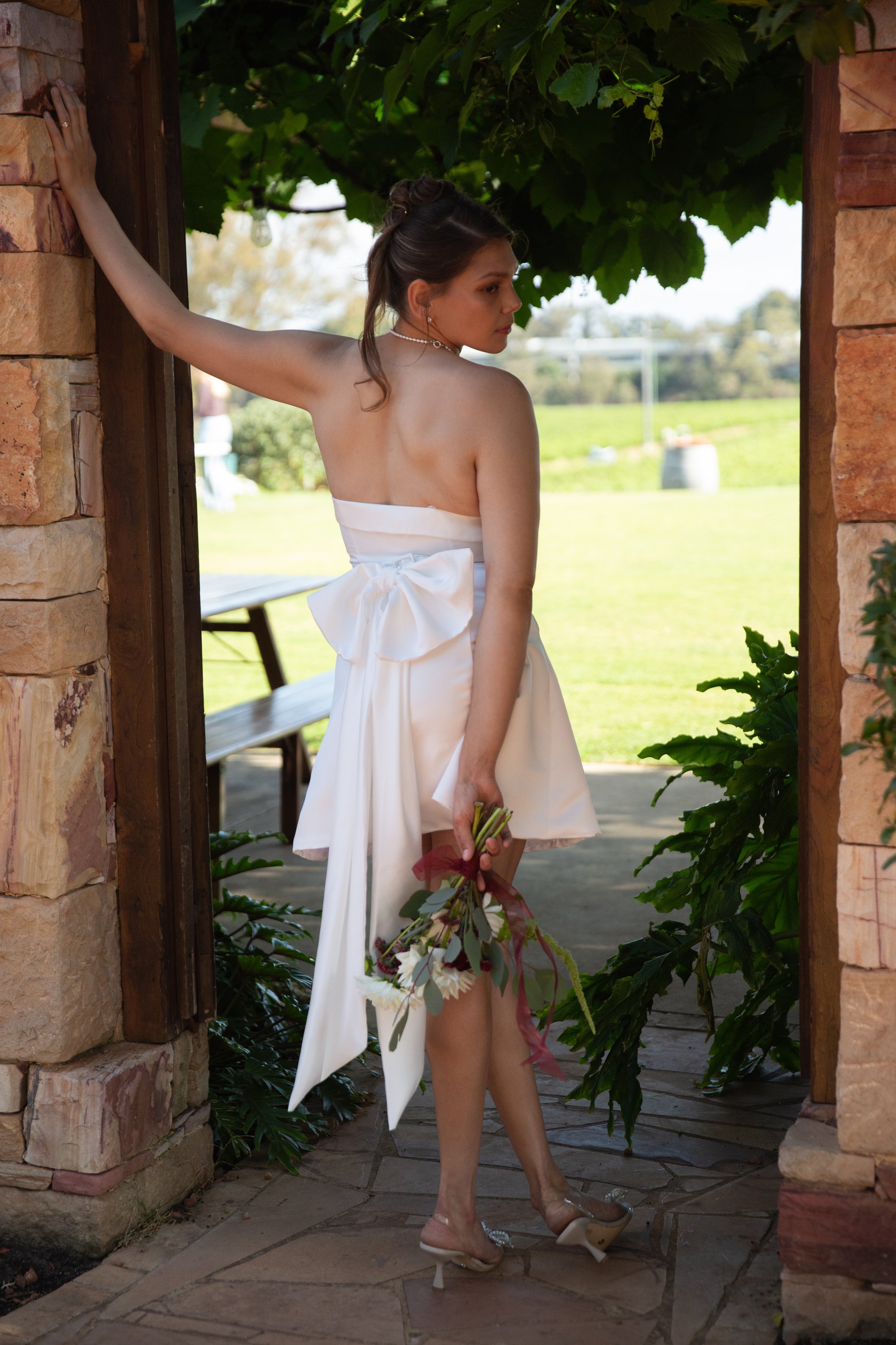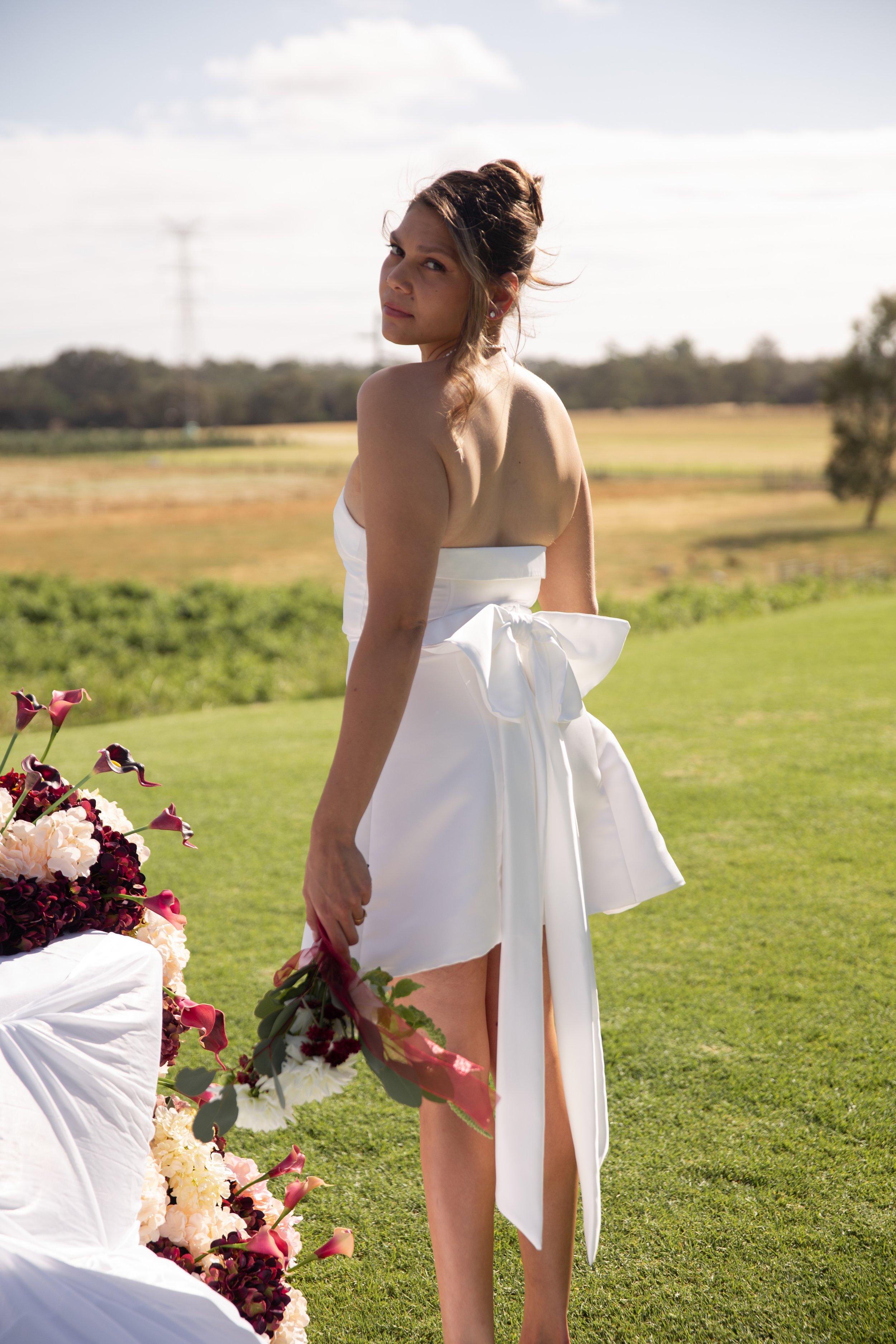 Strapless, the top features a classic fold detail following a straight across finish. At the back waist, the dress an be adjusted using the slider buckle (hidden by the bow).